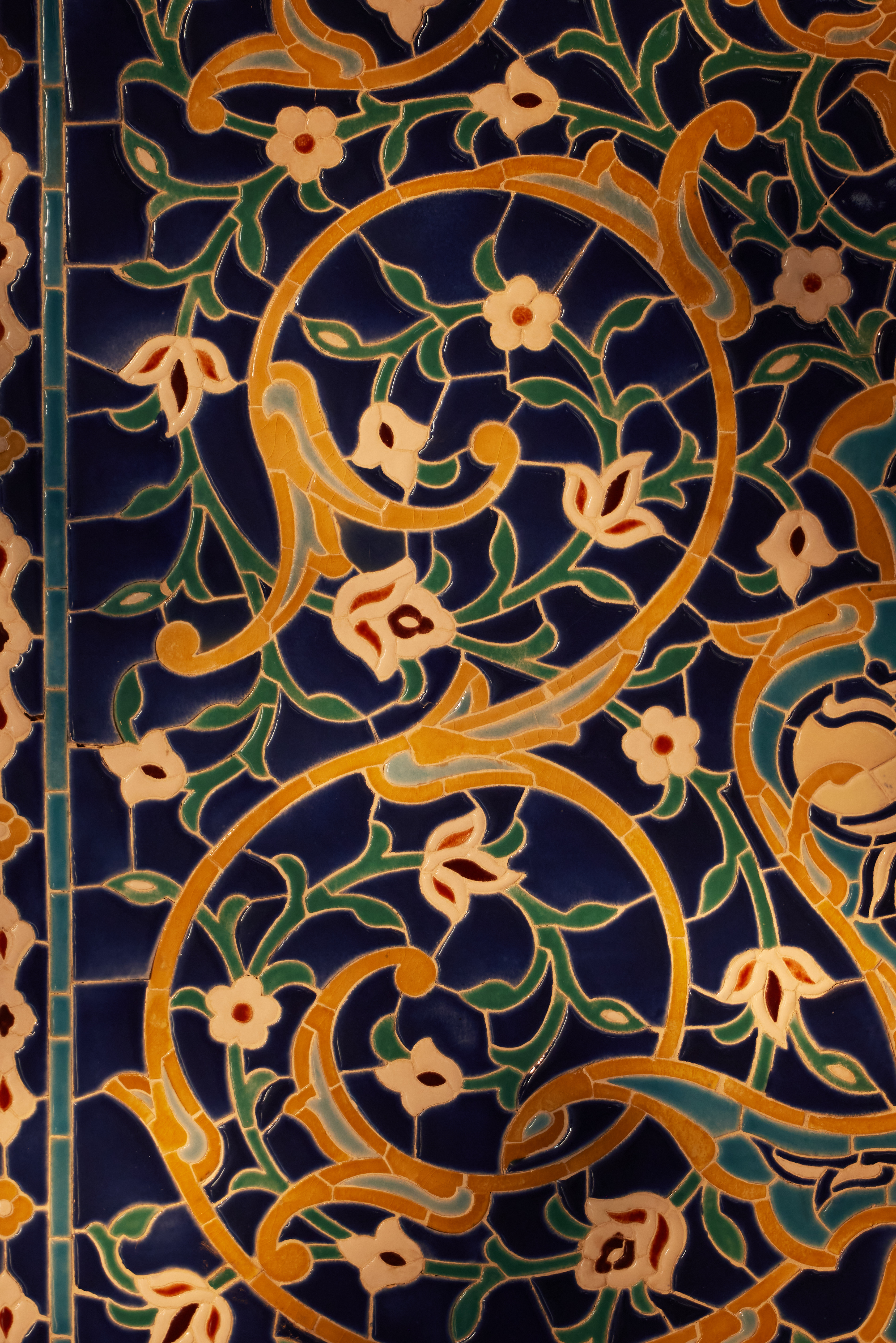 Set against a deep sapphire blue background, this composition features an elaborate network of flowing arabesque patterns intertwined with delicate floral elements. Striking golden scrollwork weaves through the design, creating a sense of movement, elegance, and grandeur, while subtle touches of turquoise and white bring balance and refinement.