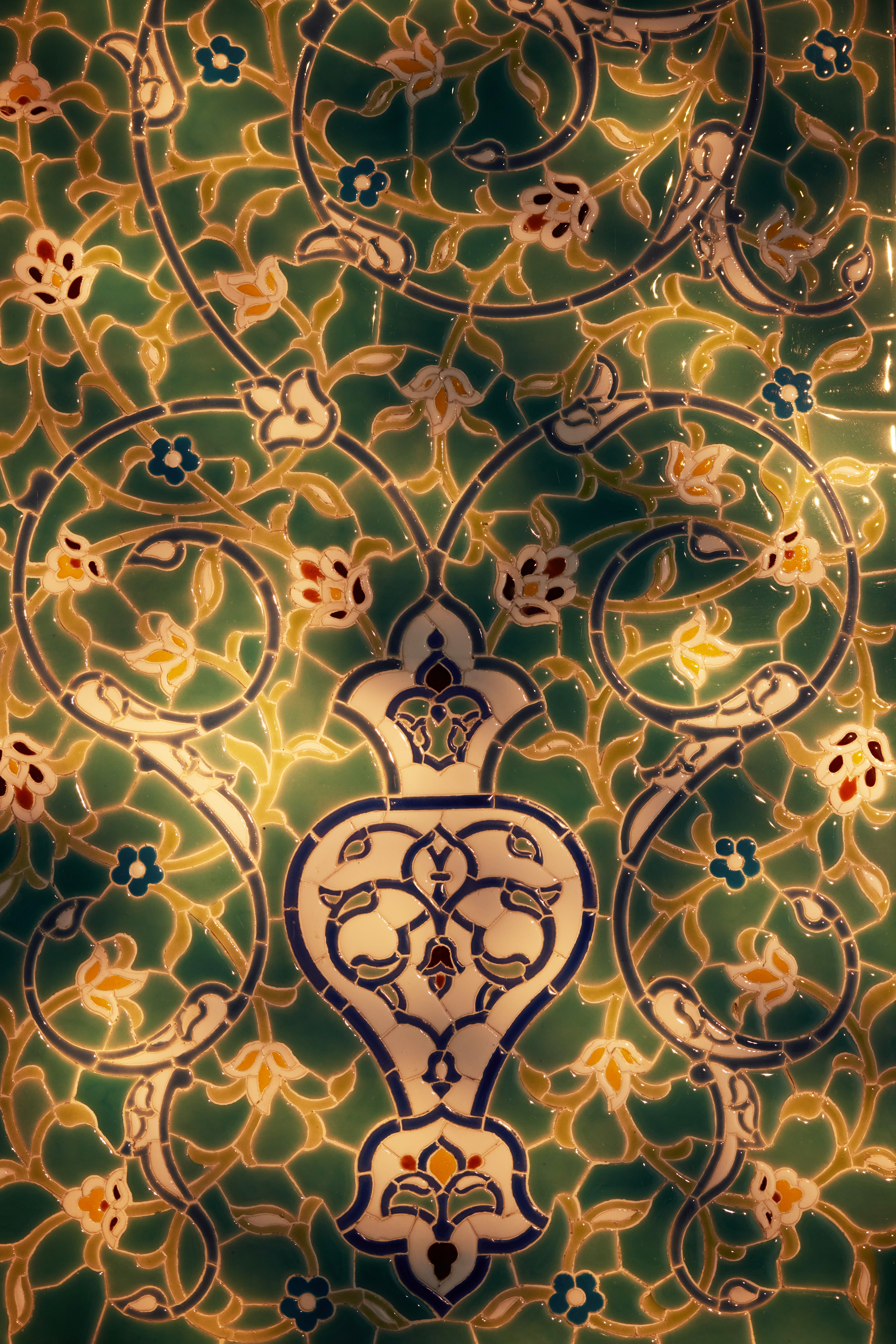 The upper section is adorned with a geometric lattice pattern, adding contrast and depth, while the central field remains fluid and organic. At the base, an ornamental motif anchors the design, completing the vertical composition with a sense of symmetry and refinement.