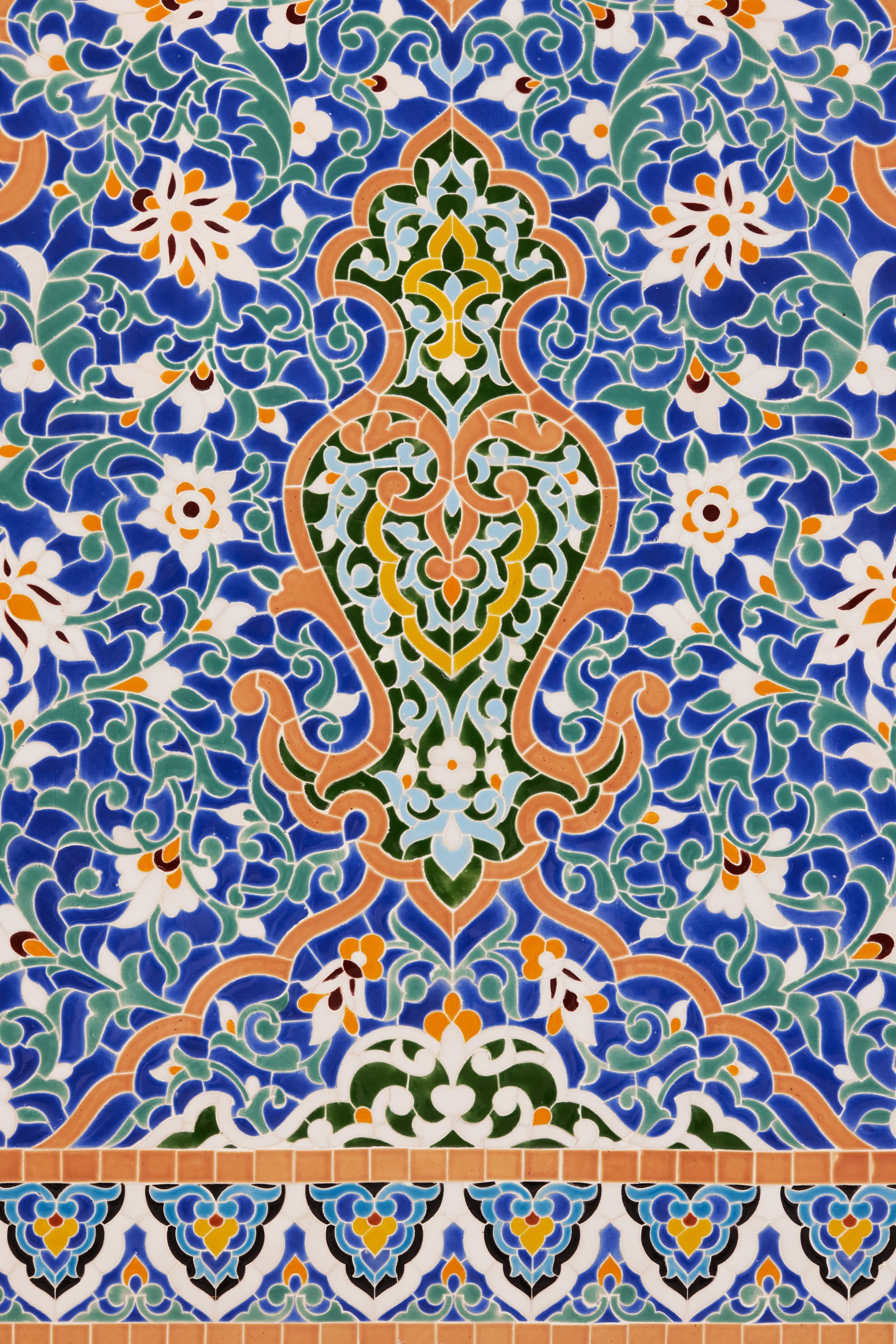 At the heart of the composition lies a beautifully balanced arabesque pattern, where flowing floral motifs intertwine with geometric precision. Rich shades of deep blue and emerald green create a sense of depth and serenity, while warm terracotta and golden accents add contrast and elegance. Delicate white blossoms are carefully integrated throughout the design, symbolizing purity and timeless beauty.