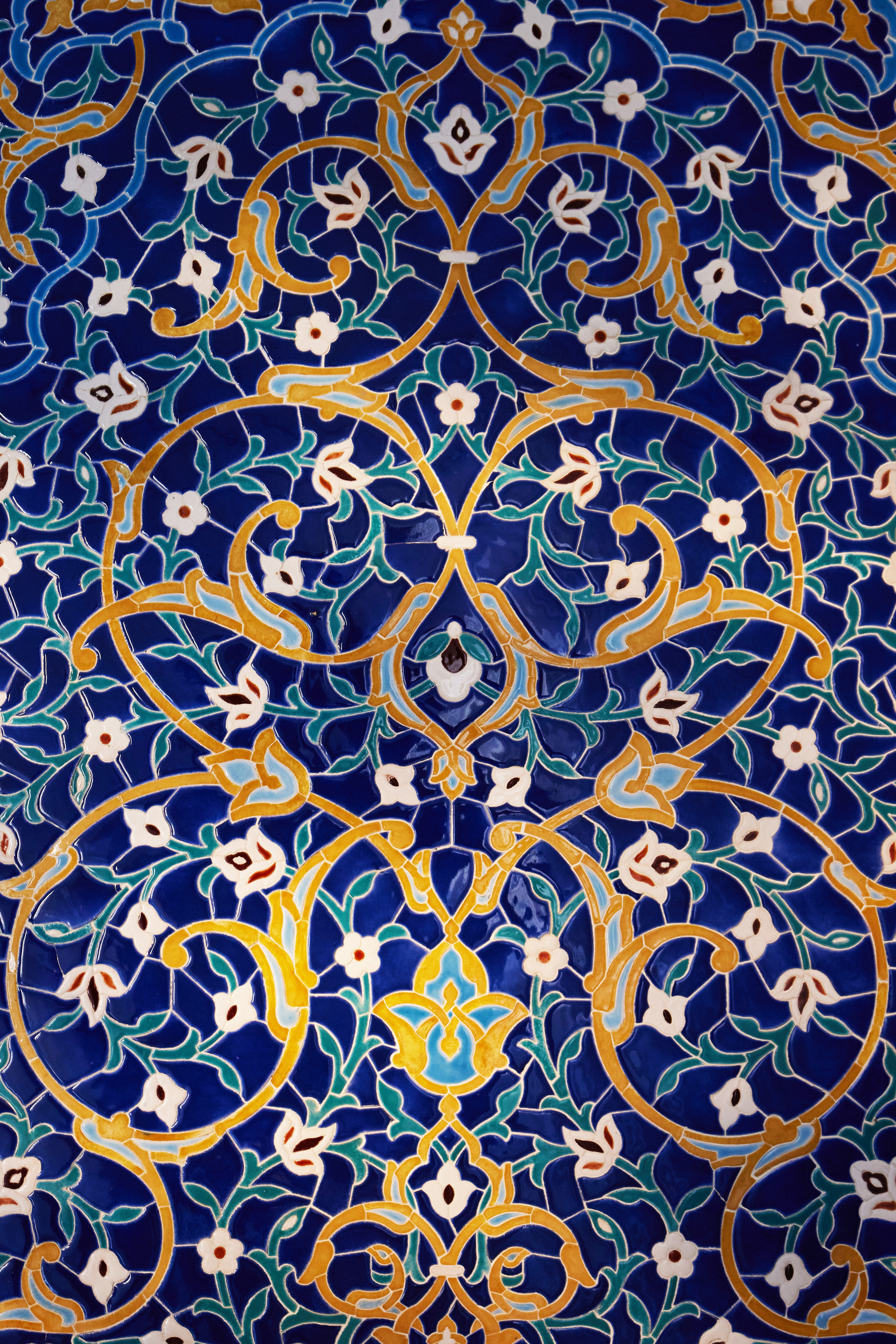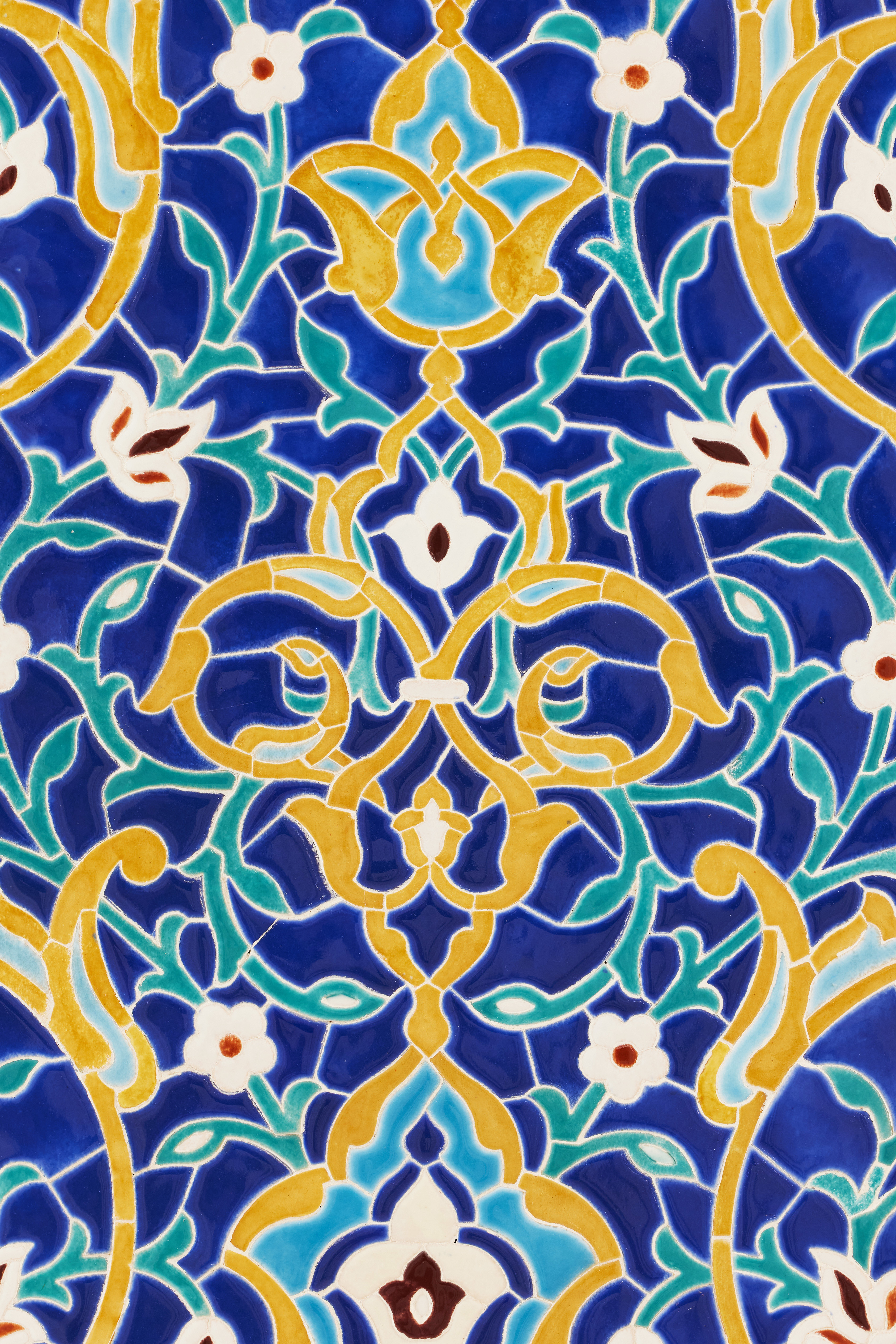 Set against a deep sapphire blue background, this composition features an elaborate network of flowing arabesque patterns intertwined with delicate floral elements. Striking golden scrollwork weaves through the design, creating a sense of movement, elegance, and grandeur, while subtle touches of turquoise and white bring balance and refinement.